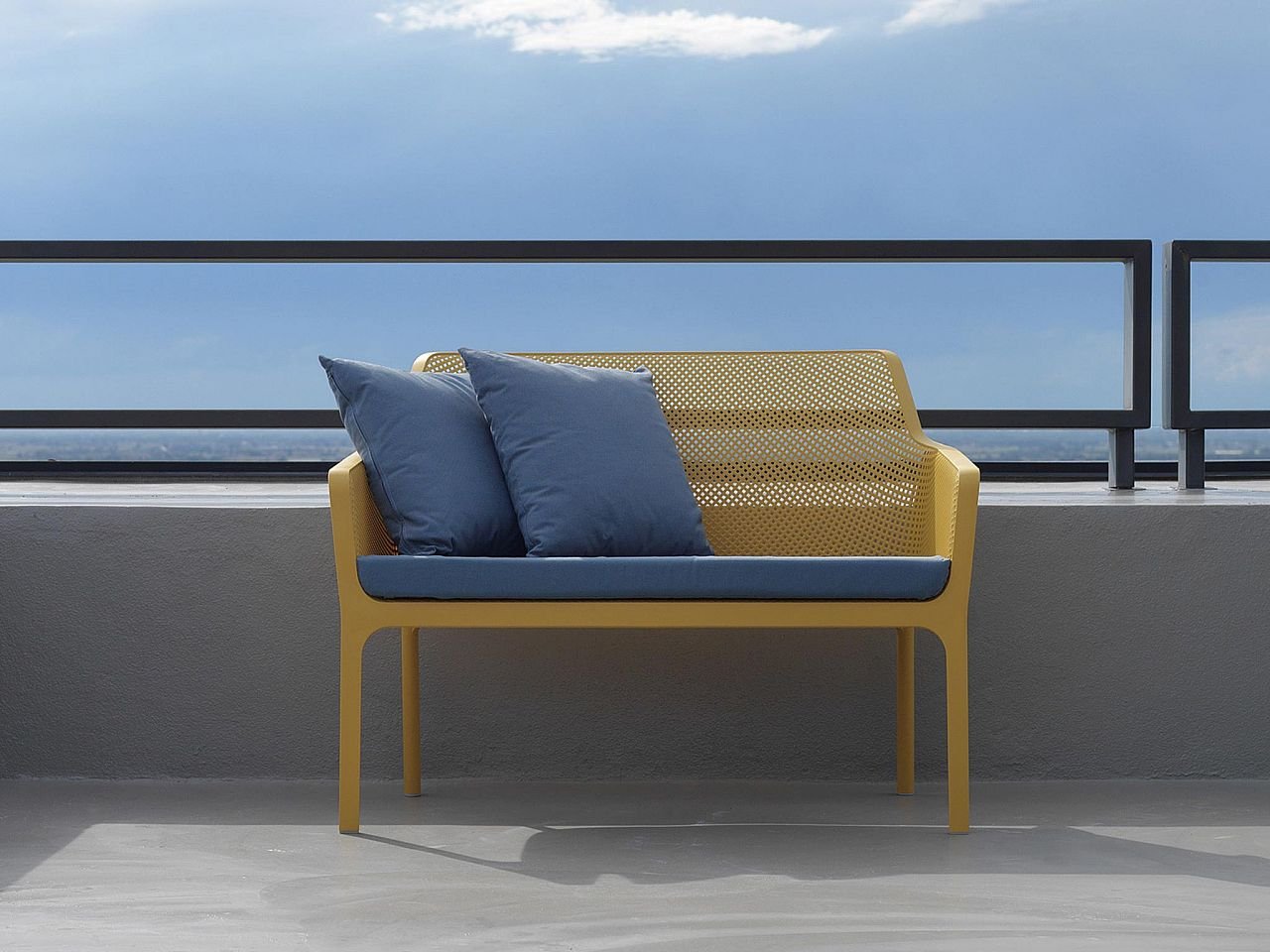 Divano da esterno moderno realizzato in fiberglass colorato in massa e trattato anti-UV. Divano impilabile dotato di piedini antiscivolo e finitura matt. Su richiesta, è possibile abbinare al divano un cuscino imbottito per rendere la seduta del divano più confortevole. Disponibile in 6 diverse varianti di colore.