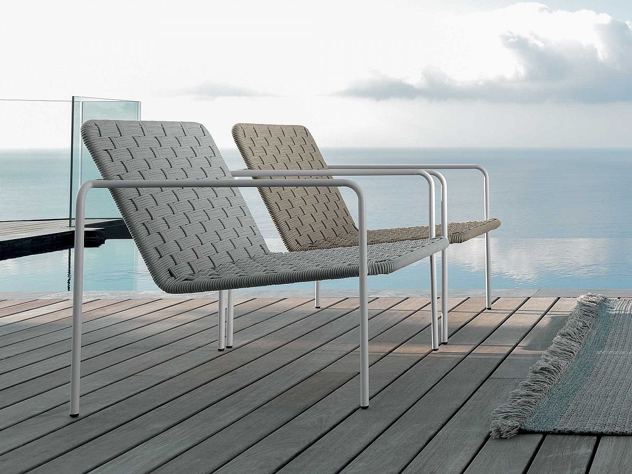 Poltrona Jackie di Talenti: realizzata con una struttura in acciaio inox, e la seduta e lo schienale sono rivestiti da corde intrecciate a mano, disponibile in 3 varianti di colore.