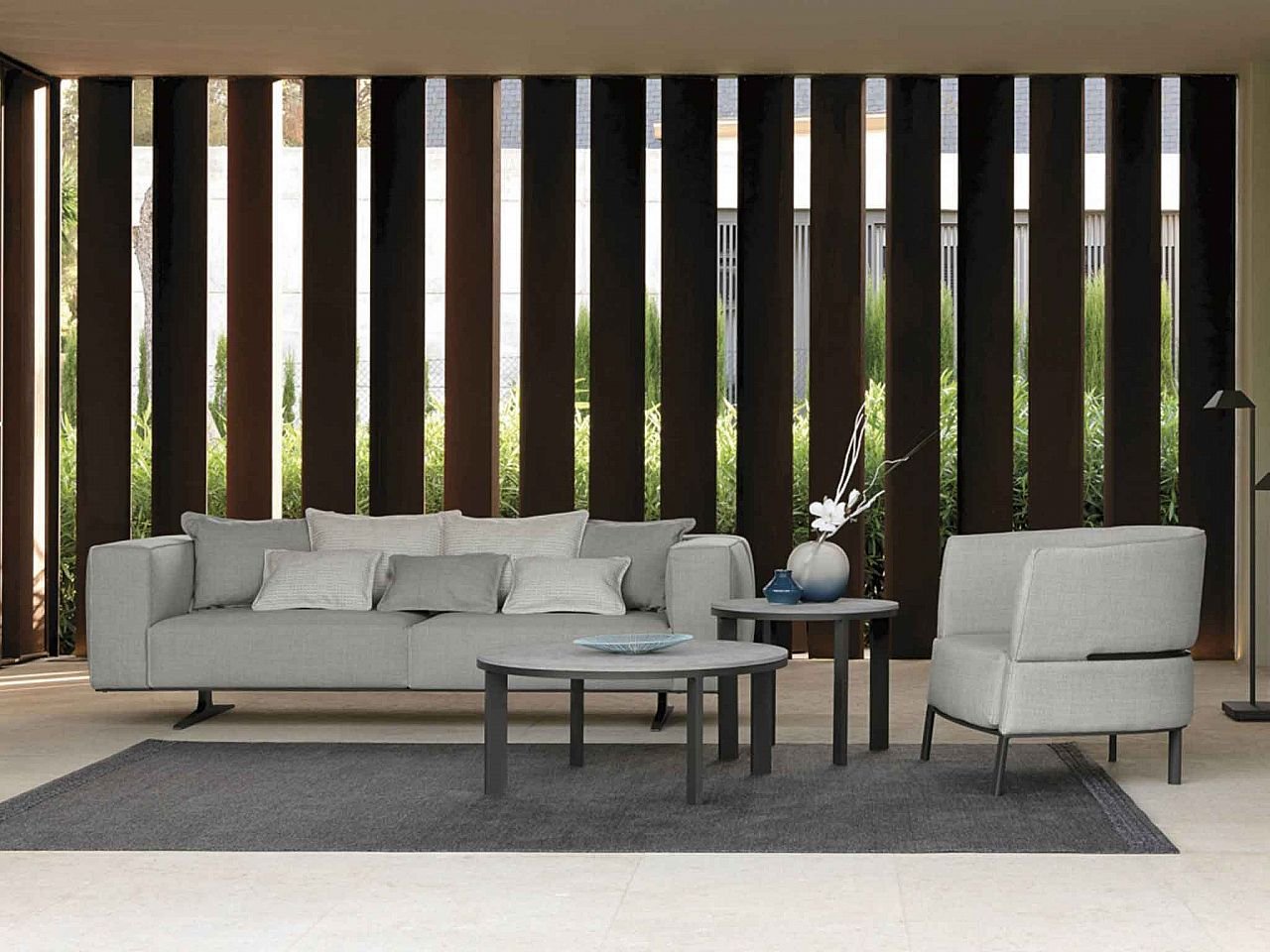Tavolino Caffè Eden di Talenti, tavolino da giardino con struttura in alluminio verniciata in colore bianco o grafite, piano rotondo D 90 in grès porcellanato da 6 mm per la versione bianca e in fibra di cemento da 12 mm per la versione grafite.
