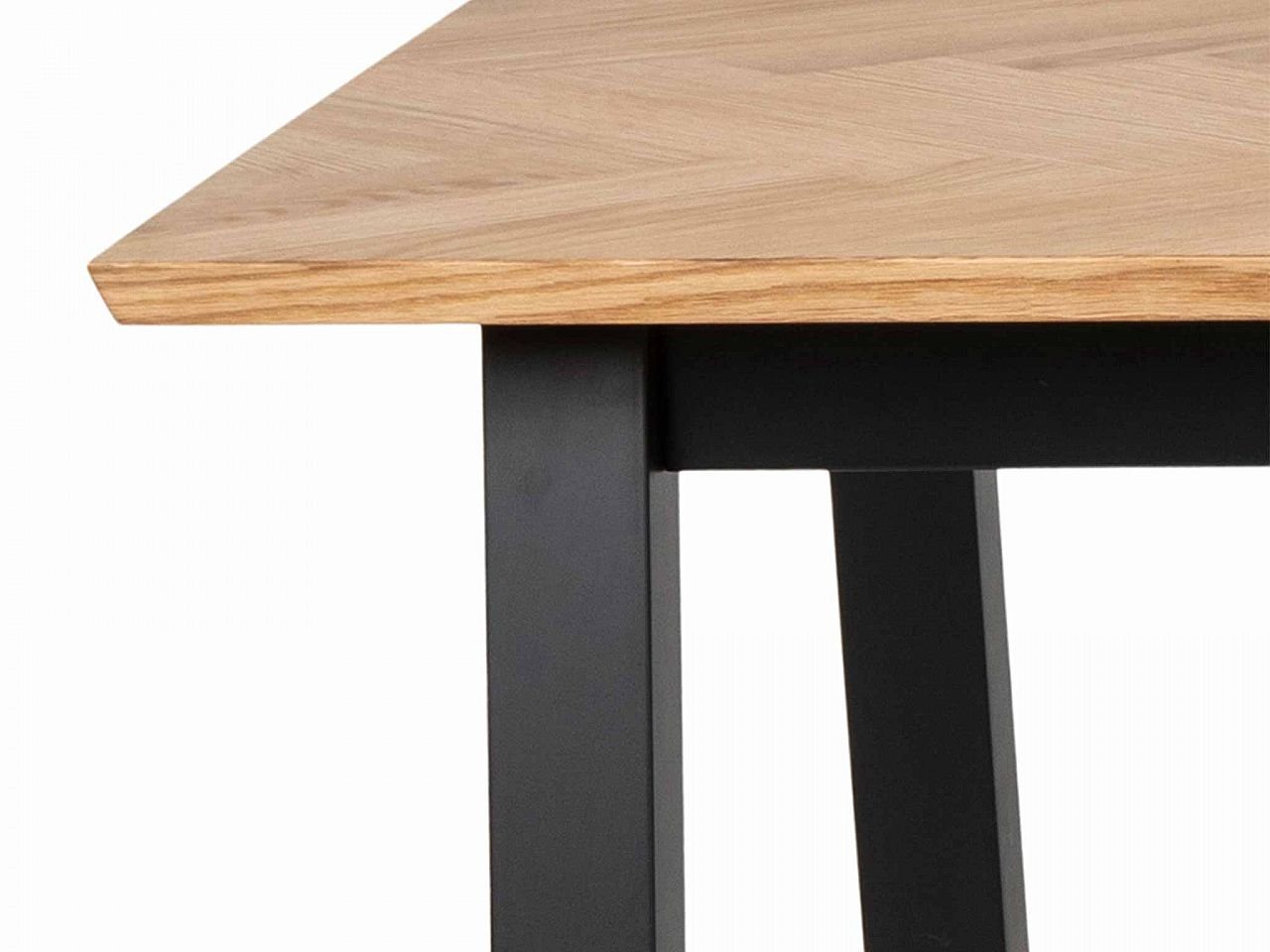 Tavolo con struttura in legno MDF verniciato nero e piano in rovere impiallacciato a spina di pesce.