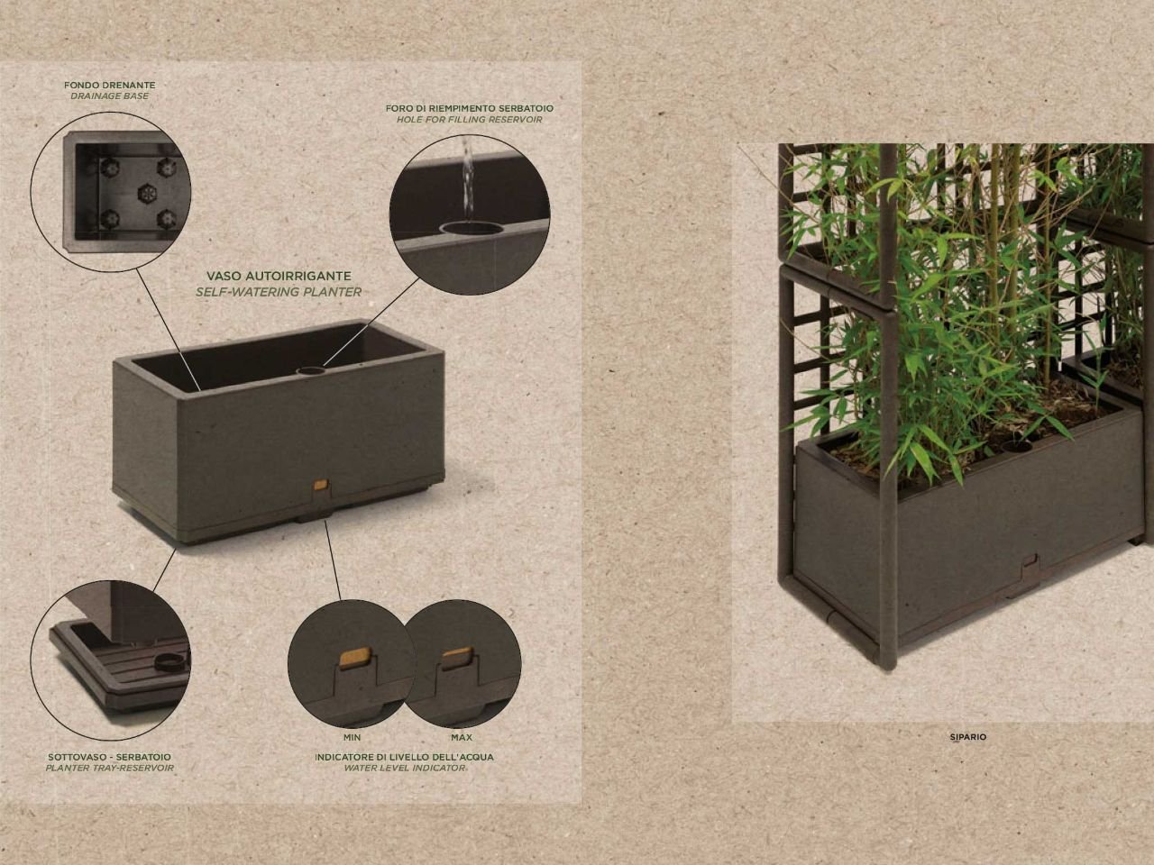 Dotato di uno speciale vaso contenitore per piante con sistema autoirrigante.